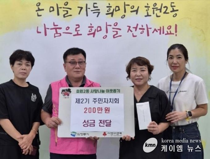 (케이엠뉴스) 의정부시 호원2동주민센터는 8월 25일 호원2동 주민자치회가 제2기 임기를 마무리하며 어려운 이웃을 돕기 위한 성금 200만 원을 기탁했다고 밝혔다.