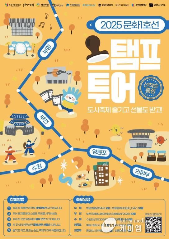 (케이엠뉴스) 의정부문화재단은 수도권 1호선 라인을 따라 펼쳐지는 특별한 문화여행, ‘문화1호선 스탬프투어’를 오는 8월부터 11월까지 의정부, 부평, 부천, 영등포, 수원 5개 법정문화도시 축제 현장에서 운영한다고 밝혔다.