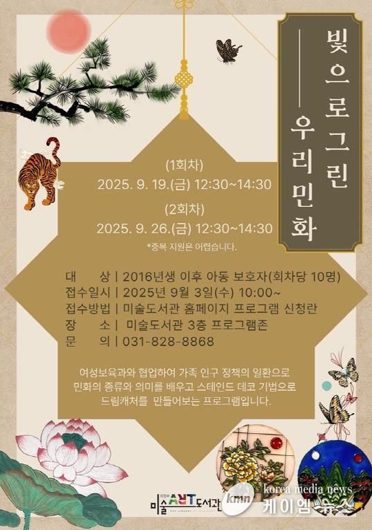 프로그램은 9월 19일과 26일 두 차례에 걸쳐 의정부미술도서관에서 ▲민화의 종류와 의미 배우기 ▲스테인드 데코 드림캐처 만들기로 진행된다. 참가비는 무료이며, 자녀(2016년 이후 출생)가 있는 부모 또는 보호자라면 누구나 신청할 수 있다.