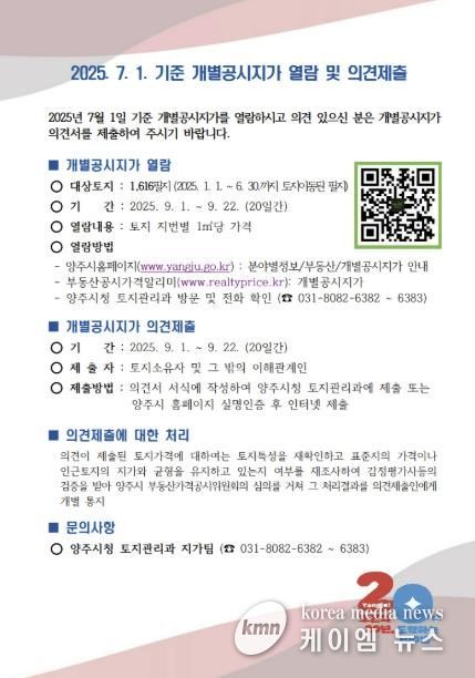 (케이엠뉴스) 양주시는 9월 1일부터 9월 22일까지 2025년 7월 1일 기준 개별공시지가 열람과 의견제출을 받는다.