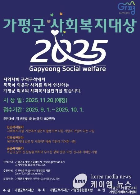 (케이엠뉴스) 가평군은 가평군복지재단과 가평신용협동조합이 공동 주최하는 ‘2025년 가평군사회복지대상’ 후보자를 오는 10월 1일까지 접수한다고 밝혔다.
