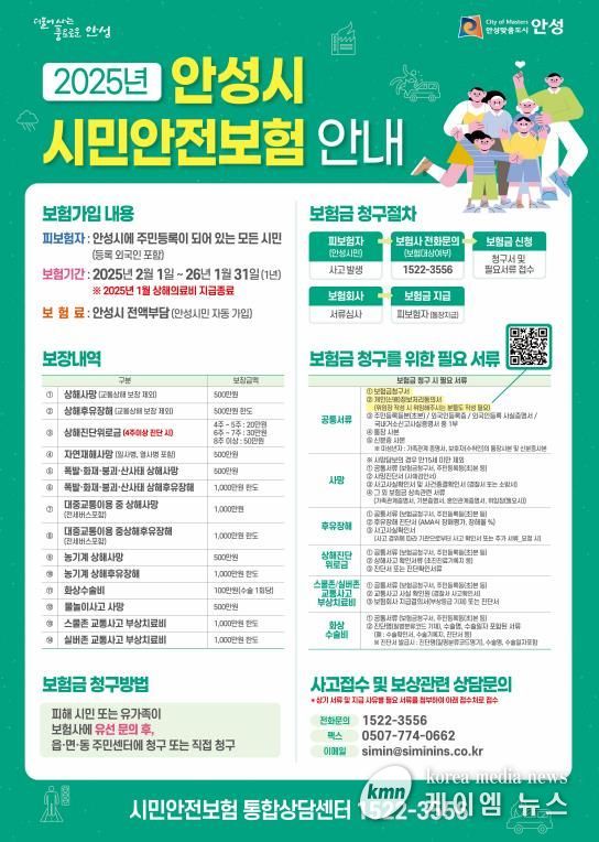 (케이엠뉴스) 안성시는 예기치 못한 사고로 피해를 입은 시민들의 생활안정과 복지 향상에 기여하기 위해 ‘2025년 안성시 시민안전보험’을 지속적으로 운영하고 있다.