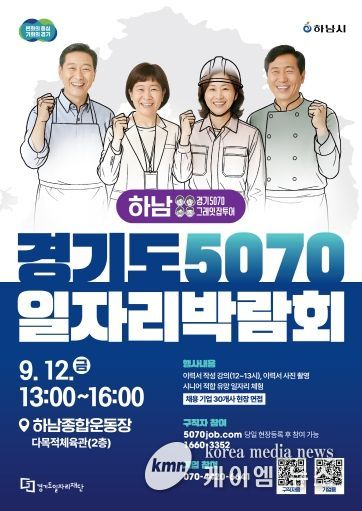 (케이엠뉴스) 경기도와 경기도일자리재단은 50~70대 중장년층의 재취업을 지원하기 위해 오는 9월 12일, 하남종합운동장 다목적체육관에서 ‘2025 경기도 5070 일자리박람회 in 하남’을 개최한다.
