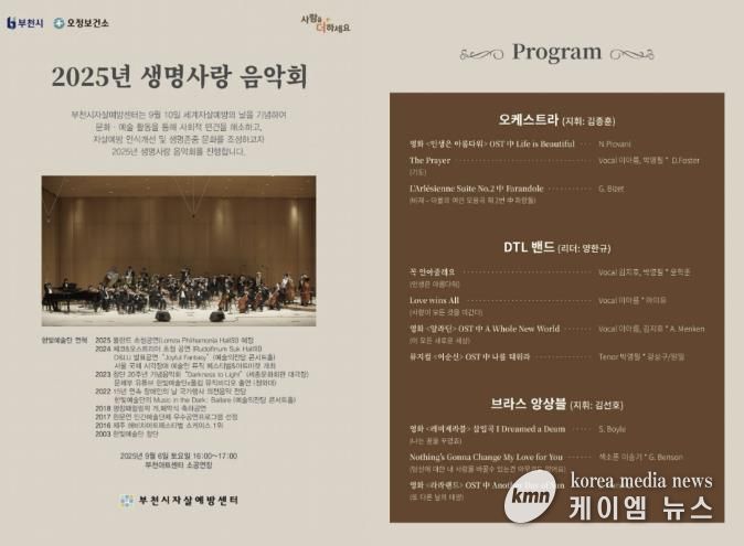 한편 부천시는 이번 음악회에 이어 9월 13일 부천중앙공원에서 ‘생명사랑 희망나눔 캠페인’을 열 예정이다. 이와 함께 부천시자살예방센터는 앞으로도 생명존중 문화 확산을 위한 시민 인식개선 활동을 지속적으로 추진해 나갈 계획이다.