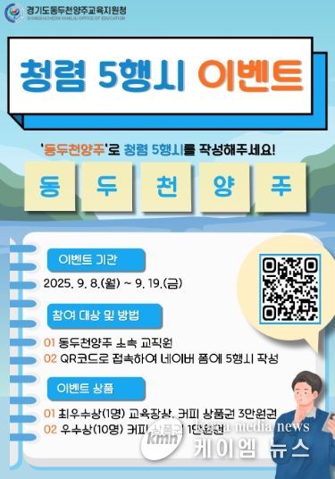 (케이엠뉴스) 동두천양주교육지원청은 교직원들이 자발적으로 참여하며 청렴의 가치를 되새길 수 있도록, ‘청렴 5행시 짓기 이벤트’를 9월 8일부터 19일까지 실시한다고 밝혔다.