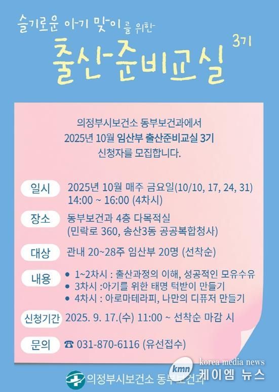 (케이엠뉴스) 의정부시 보건소 동부보건과는 관내 20~28주 임산부를 대상으로 ‘임산부 출산준비교실’ 프로그램 3기 대상자 20명을 9월 17일부터 선착순 모집한다.