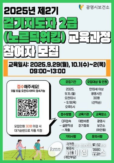 (케이엠뉴스) 광명시 보건소는 ‘2025년 제2기 걷기지도자 2급(노르딕 워킹) 양성 교육 과정’ 참여자를 모집한다.