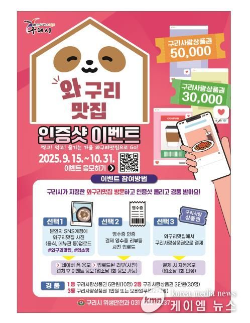 (케이엠뉴스) 구리시는 9월 15일부터 10월 31일까지 지역 대표 브랜드인 ‘와구리 맛집’으로 지정된 55개 업소를 대상으로 시민 인증 사진 이벤트를 진행한다고 밝혔다.