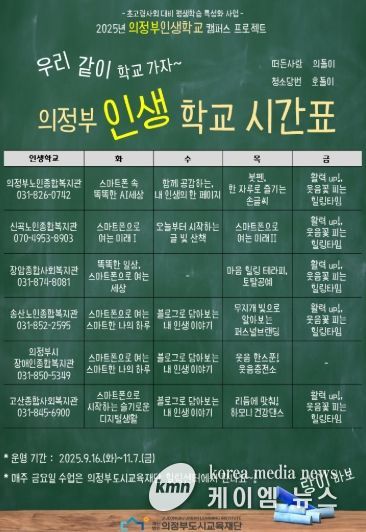 (케이엠뉴스) (재)의정부도시교육재단이 지난 7월 25일 (재)의정부시평생학습원과 (재)의정부시청소년재단과의 통합재단으로서 출범식을 통해, 전 생애 학습을 위한 도시교육의 새로운 시작을 열고, 오는 9월 16일부터 초고령사회 대응을 위한‘의정부인생학교 캠퍼스 프로젝트(이하 의정부인생학교)’를 개강한다고 밝혔다.