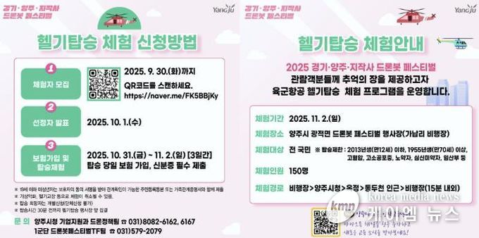 (케이엠뉴스) 양주시가 오는 9월 30일까지 '2025 드론봇 페스티벌' ‘헬기탑승체험’ 참가 희망자를 모집한다.