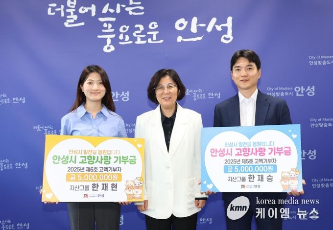(케이엠뉴스) 안성시는 15일 본청 시장실에서 ‘안성시 고향사랑기부제 고액기부금 전달식’을 열고, 지산그룹의 한재승 이사와 한재현 변호사가 각각 500만 원씩 총 1천만 원을 고향사랑기부금으로 기탁했다고 밝혔다.