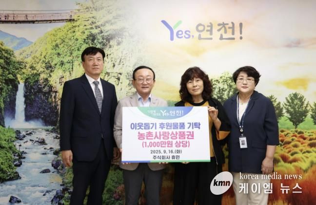 (케이엠뉴스) 연천군 전곡읍 소재 주식회사 휴민은 지난 16일 추석을 앞두고 지역사회 따뜻한 나눔을 실천하고자 1,000만원 상당의 농촌사랑상품권을 연천군에 기탁했다고 밝혔다.