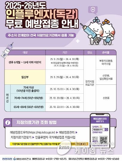 (케이엠뉴스) 하남시가 감염병 예방 및 확산 방지를 위해 오는 9월 22일부터 내년 4월 30일까지 어린이, 임신부, 노약자 등을 대상으로 독감(인플루엔자) 국가예방접종을 무료로 시행한다고 밝혔다.