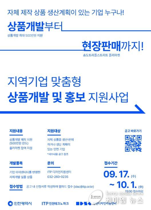 (케이엠뉴스) 인천테크노파크(인천TP)는 오는 10월 1일까지 ‘2025년도 인천광역시 지역기업 맞춤형 상품개발 및 홍보 지원사업’에 참여할 중소기업을 모집한다.