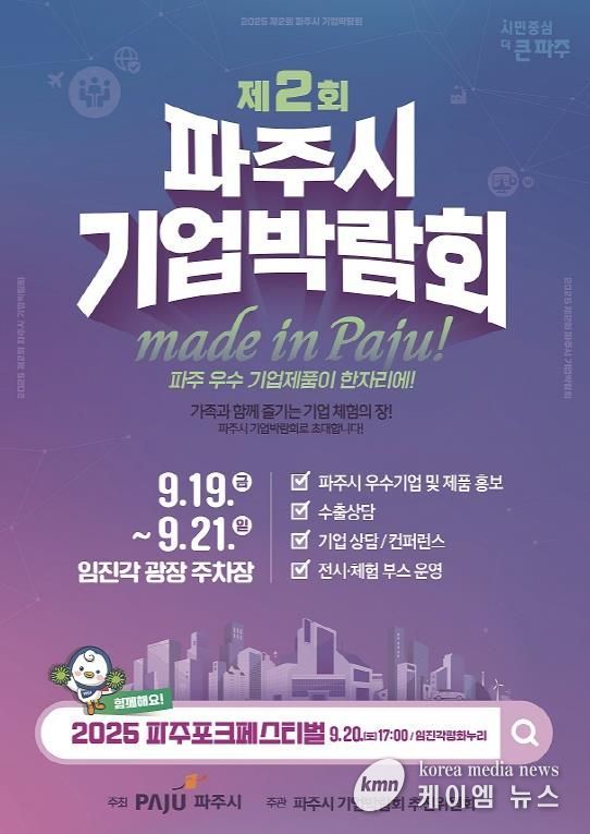 (케이엠뉴스) 지역 기업과 시민이 함께하는 축제 ‘메이드 인 파주(MADE IN PAJU)! 2025 제2회 파주시 기업박람회’가 오는 19부터 21일까지 3일간 임진각 광장에서 열린다.