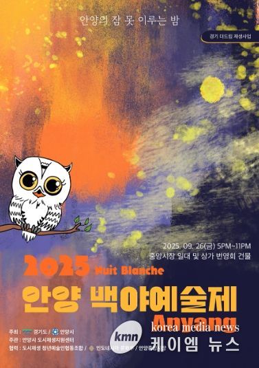 (케이엠뉴스) 안양시는 이달 26일 오후 5시부터 11시까지 만안구 안양4동 안양중앙시장에서 청년들이 즐길 수 있는 ‘안양 백야예술제(Nuit Blanche Anyang)’를 개최한다고 19일 밝혔다.