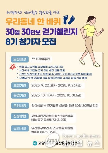 (케이엠뉴스) 고양특례시 일산동구보건소는 지역주민의 체력증진과 신체활동량 증가를 위한‘우리동네 한 바퀴 30일 30만보 걷기챌린지’8기 참가자를 22일부터 모집한다고 밝혔다.