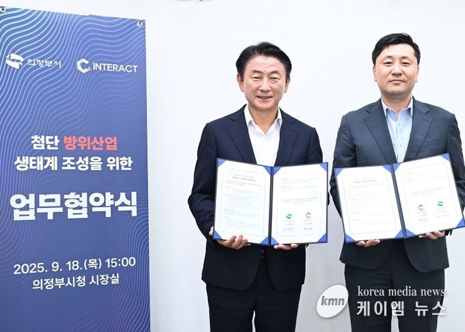 (케이엠뉴스) 의정부시는 9월 18일 XR(확장현실) 기술 기반 교육훈련 시스템 전문 기업 ㈜인터랙트와 ‘첨단 방위산업 생태계 조성’을 위한 업무협약을 체결했다.
