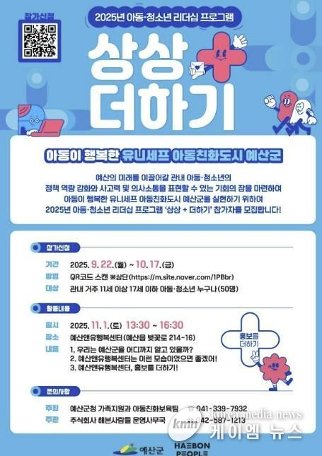 ‘상상+더하기 아동·청소년 리더십 프로그램’은 11월 1일 오후 1시 30분, 예산앤유행복센터에서 열릴 예정이며, 참가자들은 아동친화도시에 대한 이해를 바탕으로 아이디어 발굴, 정책 제안 등 다양한 참여형 활동에 참여할 예정이다.