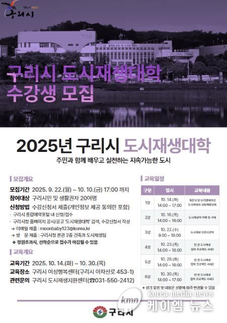 (케이엠뉴스) 구리시는 9월 22일부터 10월 10일까지 '2025년 구리시 도시재생 대학' 수강생을 모집한다고 밝혔다.
