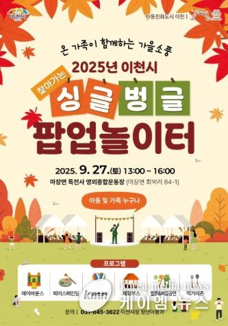 (케이엠뉴스) 이천시는 아동친화도시 놀이문화 확산과 아동의 놀 권리 보장을 위해 '찾아가는 싱글벙글 팝업 놀이터 ‘가을소풍’' 행사를 오는 9월 27일 마장면 특전사 영외종합운동장에서 개최한다고 밝혔다.