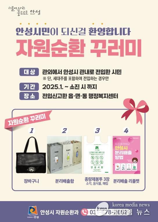 전입세대 자원순환 꾸러미 사업은 지자체별로 생활쓰레기 배출 및 처리방법이 달라서 타시군에서 온 전입가 겪는 혼란을 방지하고자 추진하는 사업으로, 꾸러미에는 분리배출 리플릿, 장바구니, 분리배출함, 종량제봉투가 들어있다. 2025년 1월 1일 이후 타 시군에서 안성시로 전입한 세대로 전입 6개월 이내에 관할 읍면동 행정복지센터에 방문하면 수령할 수 있으며 8월말 기준 1,001세대에게 자원순환 꾸러미를 지급했다.