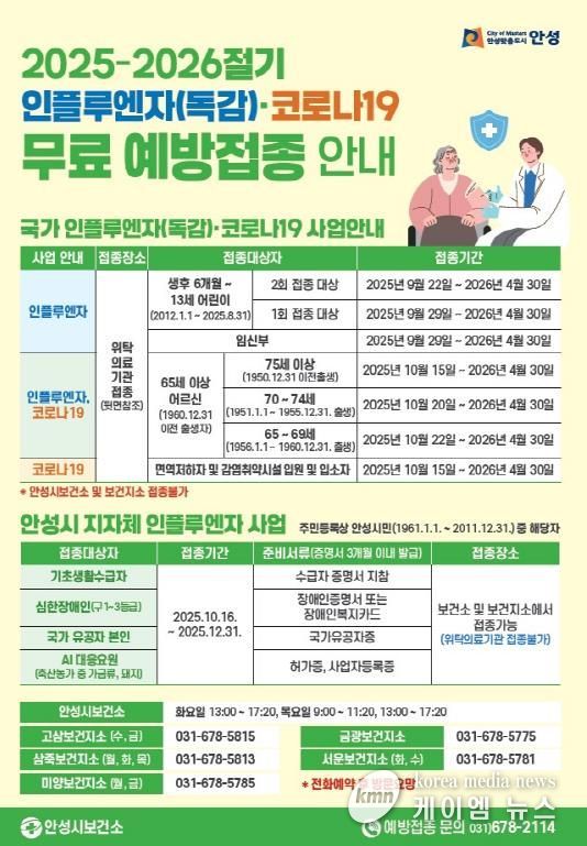 (케이엠뉴스) 안성시보건소는 오는 22일부터 내년 4월30일까지 지역 내 75개소 의료기관에서 인플루엔자 3가 백신 무료 예방접종을 실시한다고 밝혔다.