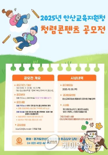 (케이엠뉴스) 경기도안산교육지원청은 9월 22일부터 10월 21일까지 한 달간 ‘2025년 청렴 콘텐츠 공모전’을 개최한다고 밝혔다.