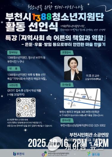 이번 활동 선언식은 부천시가 주최하고 △부천형1388청소년지원단 위촉장 및 지정서 수여, △부천형1388청소년지원단 활동 선언 퍼포먼스, △이호선 교수(숭실사이버대학교)의 '지역사회 속 어른의 책임과 역할'의 주제 특강으로 이어질 예정이다.