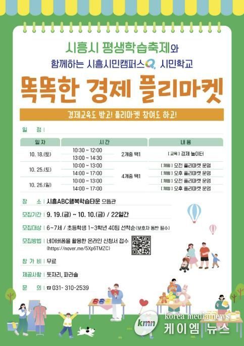 (케이엠뉴스) 시흥시는 제17회 시흥시평생학습축제(10월 24일~26일)와 연계해 어린이들의 경제활동 이해 증진과 가족 간 소통 강화를 위한 ‘똑똑한 경제 플리마켓’을 오는 10월 18일부터 시흥ABC행복학습타운 으뜸관에서 추진한다.