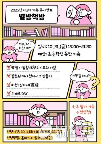 (케이엠뉴스) 삼척교육문화관은 10월 31일 가족과 함께 도서관에서 특별하고 즐거운 추억을 만들 수 있는 ‘2025년 제2차 독서캠프 ‘별밤책밤’을 운영한다.