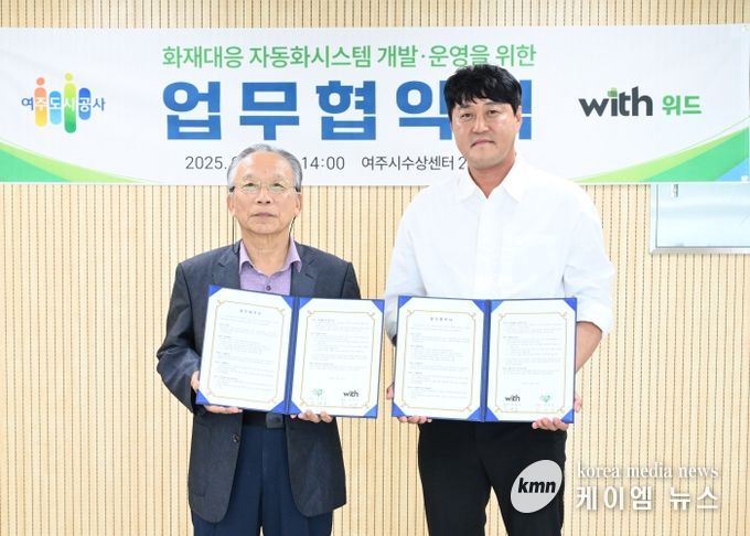 (케이엠뉴스) 여주도시공사는 2025년 9월 23일 위드(with)와 전기차 충전시설 안전 강화를 위한 업무협약(MOU)을 체결하고, 공용주차장 내 전기차 충전소에 위드(with)가 개발한 첨단 화재대응 자동화시스템을 시범 설치한다고 밝혔다.