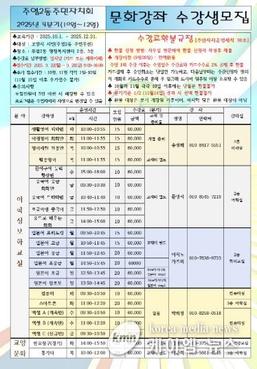 (케이엠뉴스) 고양특례시 일산서구 주엽2동 주민자치센터는 오는 9월 26일까지 4분기 문화강좌 수강생을 모집한다고 밝혔다.