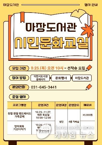 (케이엠뉴스) 이천시 마장도서관은 오는 10월 23일부터 지역 주민의 독서 문화 진흥을 위해 하반기 시민문화교실을 운영한다.