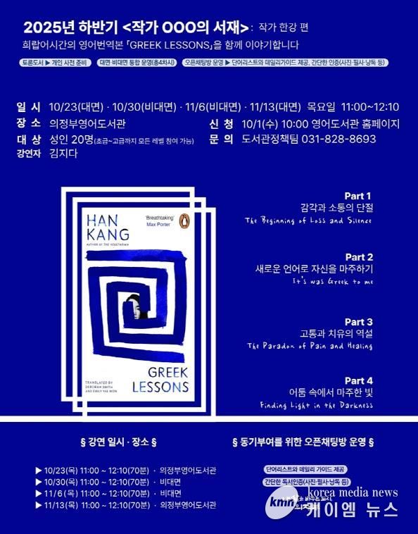 (케이엠뉴스) 의정부시 도서관은 2025년 하반기 ‘작가 OOO의 서재: 한강 편’을 10월 매주 목요일(23일, 30일, 11월 6일, 11월 13일) 총 4회에 걸쳐 의정부영어도서관에서 운영한다.