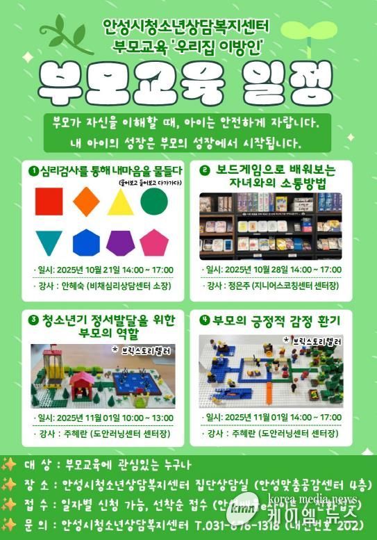 (케이엠뉴스) 안성시청소년상담복지센터는 오는 10월과 11월, 총 4회에 걸쳐 청소년 자녀를 둔 부모를 대상으로 ‘부모교육’을 진행한다고 밝혔다. 이번 교육은 자녀와의 원활한 소통과 부모의 심리적 소진 예방을 돕기 위해 마련됐다.