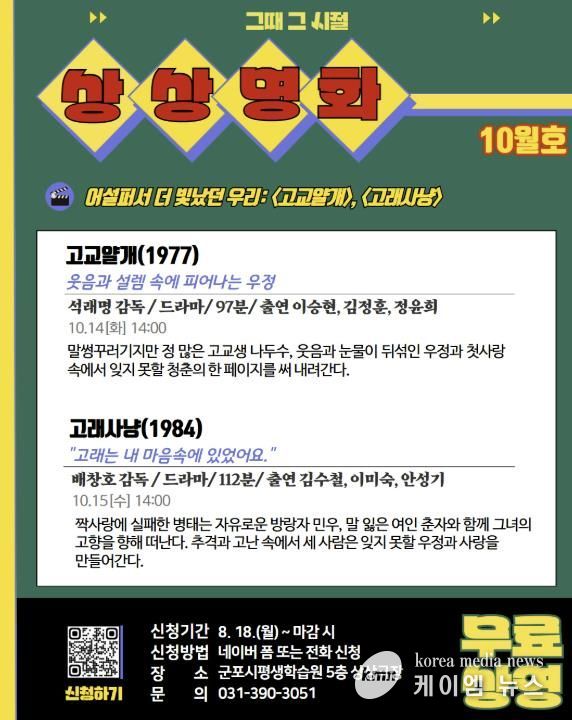 (케이엠뉴스) 군포문화재단 군포시평생학습원은 시민들의 문화 향유와 세대 공감을 위해 오는 10월 14일과 15일 상상극장에서 고전 영화 상영 프로그램 〈상상명화〉를 운영한다. 이번 상영작은 ‘고교얄개’와 ‘고래사냥’으로 무료 상영된다.