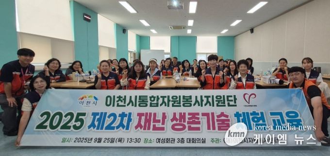 (케이엠뉴스) (재)이천시자원봉사센터는 9월 25일 여성회관 3층 대회의실에서 이천소방서 의용소방대연합회, 이천시 지역자율방재단, 대한어머니회 이천시지회를 비롯한 15개 단체 소속 자원봉사자 30여 명이 참여한 가운데 “2025년 이천시통합자원봉사지원단 제2차 재난 생존 기술 체험 교육”을 진행했다.