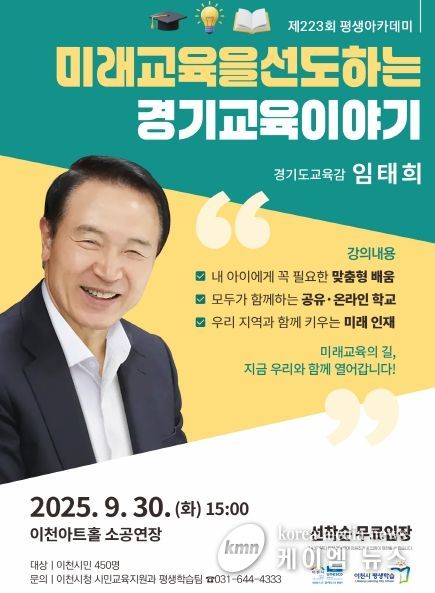 (케이엠뉴스) 이천시는 9월 30일 오후 3시, 이천아트홀 소공연장에서 임태희 경기도교육감을 초청해 “미래교육을 선도하는 경기교육 이야기”라는 주제로 제 223회 이천 평생아카데미를 개최한다.