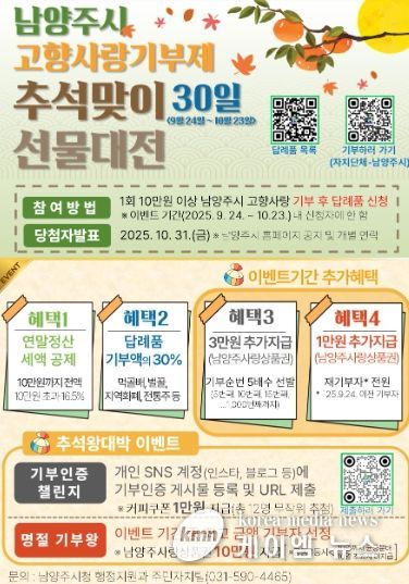 (케이엠뉴스) 남양주시는 추석 연휴에 맞춰 9월 24일부터 10월 23일까지 한 달간 고향사랑기부제 활성화를 위한 특별 이벤트를 추진한다고 26일 밝혔다.