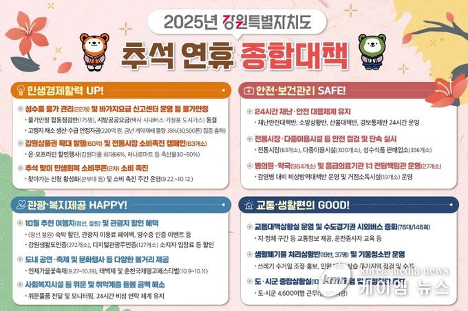 (케이엠뉴스) 강원특별자치도가 10월 3일부터 9일까지 7일간 이어지는 추석 연휴 동안 도민과 귀성객이 안전하고 편안한 명절을 보낼 수 있도록 ‘추석 연휴 종합대책’을 추진한다고 29일 밝혔다.