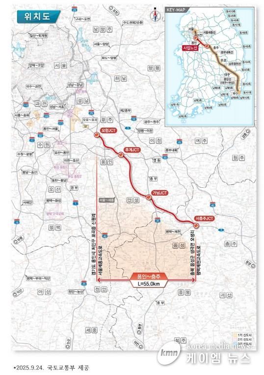 국토교통부에 따르면 안성과 용인-음성-충주를 연결하는 민자고속도로는 손익 공유형(BTO-a) 방식으로 추진되며, 총연장 약 55km, 왕복 4차로, 설계속도는 시속 110km