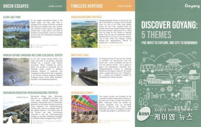 새로 발간된 관광홍보 안내지 제목은 ‘DISCOVER GOYANG: 5 THEMES’ 으로 자연·생태(Green Escapes), 역사·문화(Timeless Heritage) 등 5개의 테마로 분류해 관광지를 소개한다. 특히 방문객의 관심사와 취향에 맞춰 맞춤형 여행코스를 선택할 수 있도록 구성된 것이 특징이다.
