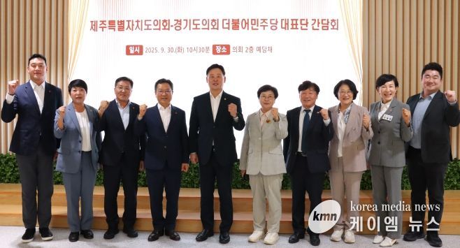 (케이엠뉴스) 경기도의회 더불어민주당이 30일 예담채에서 교섭단체 운영현황 공유 및 상호 교류·협력 강화를 위해 경기도의회를 방문한 제주도의회 더불어민주당과 간담회를 진행했다.