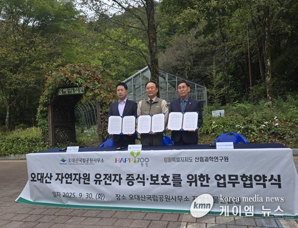 (케이엠뉴스) 강원특별자치도 산림과학연구원은 9월 30일 국립공원공단 오대산국립공원사무소, 평창군과 우수 산림 유전자원 보존을 위한 업무협약을 체결하고, 오대산국립공원 내 보호수로 지정된 잎갈나무의 후계목을 육성하고 있다고 밝혔다.