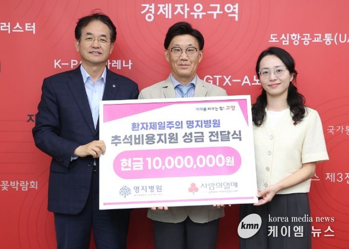 (케이엠뉴스) 고양특례시는 지난 29일 명지병원으로부터 어려운 가정의 추석 비용 지원을 위한 사랑의 성금 1천만 원을 전달받았다고 밝혔다.