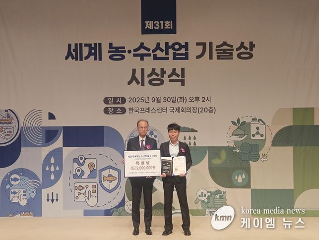 (케이엠뉴스) 강원특별자치도는 도내수면자원센터 소속 김용석 해양수산연구사(시험팀장)가 9월 30일 한국프레스센터 국제회의장에서 열린 제31회 '세계 농‧수산업기술상' 시상식에서 수산업 분야 기술개발 부문에서 공무원으로는 유일하게 유공공무원 특별상을 수상했다고 밝혔다.