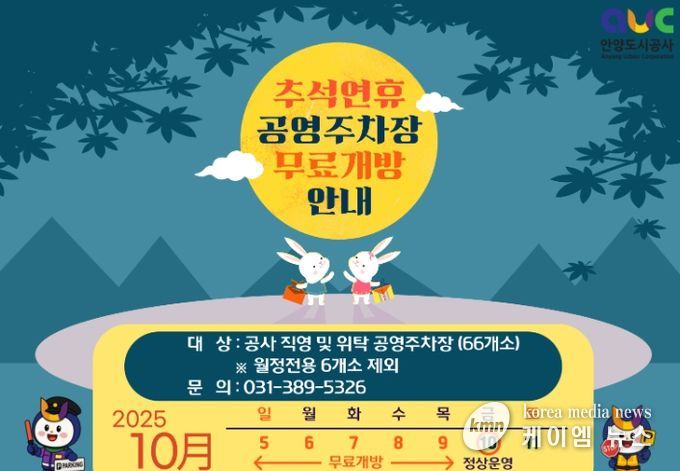 (케이엠뉴스) 안양시는 추석 명절을 맞아 오는 5일부터 9일까지 관내 유료 공영주차장 66곳을 무료 개방한다고 1일에 밝혔다.