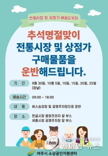(케이엠뉴스) 여주시는 여주시소상공인지원센터 주관으로 다가오는 추석 명절을 맞이하여 전통시장과 상점가를 찾는 시민들의 편의를 돕고 전통시장 활성화를 위해 ‘전통시장 및 상점가 배송 도우미’ 서비스를 운영한다.