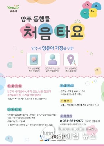 (케이엠뉴스) 양주시가 오는 10월 20일부터 읍·면 지역 24개월 이하 영유아를 동반한 보호자 이동지원차량 ‘처음타요’를 시범 운영한다.